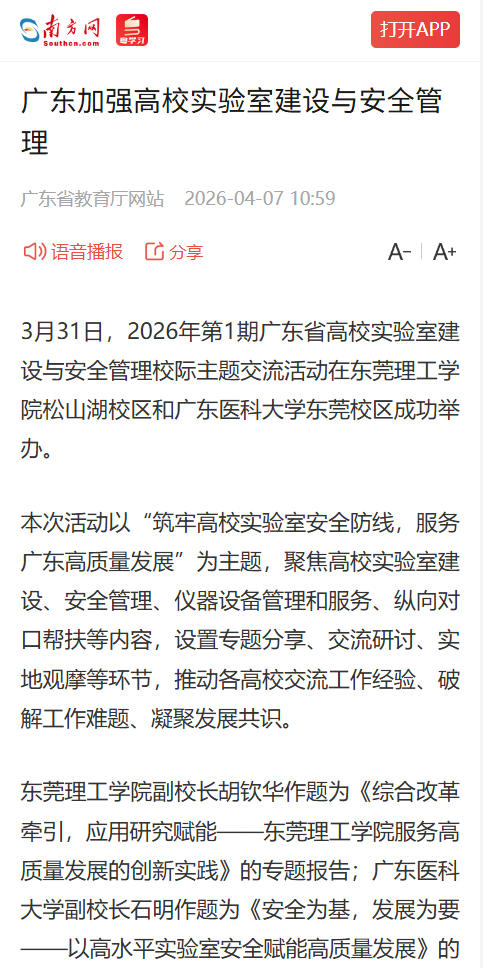 3月31日,2026年第1期广东省高校实验室建设与安全管理校际主题交流活动在东莞理工学院松山湖校区和广东医科大学东莞校区成功举办。