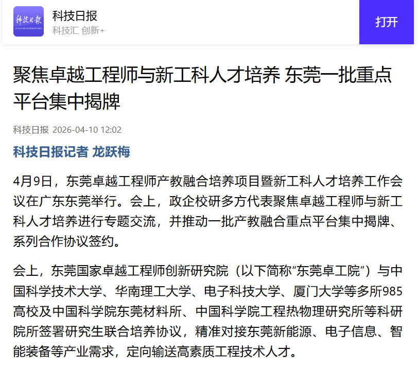 4月9日,东莞卓越工程师产教融合培养项目暨新工科人才培养工作会议在广东东莞举行。会上,政企校研多方代表聚焦卓越工程师与新工科人才培养进行专题交流,并推动一批产教融合重点平台集中揭牌、系列合作协议签约。