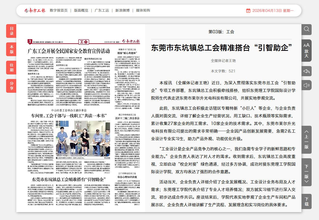 “工业设计是企业产品竞争力的核心之一,我们急需专业学子的新鲜思路和专业能力。”企业负责人表达了对人才的渴求。收到需求后,东坑镇总工会高度重视,立即启动“校企对接”绿色通道,经过多方协调,成功对接东莞理工学院国际设计学院,双方均表达了强烈的合作意愿。