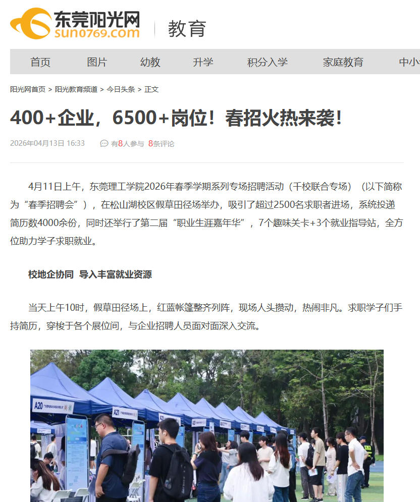 4月11日上午,东莞理工学院2026年春季学期系列专场招聘活动(千校联合专场)(以下简称为“春季招聘会”),在松山湖校区假草田径场举办,吸引了超过2500名求职者进场,系统投递简历数4000余份,同时还举行了第二届“职业生涯嘉年华”,7个趣味关卡+3个就业指导站,全方位助力学子求职就业。