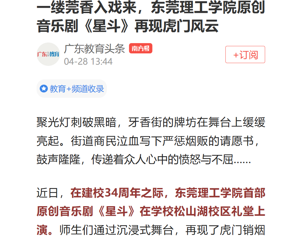 近日,在建校34周年之际,东莞理工学院首部原创音乐剧《星斗》在学校松山湖校区礼堂上演。师生们通过沉浸式舞台,再现了虎门销烟这一改写民族命运的历史壮举。