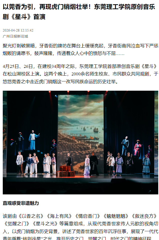 4月25日、26日,在建校34周年之际,东莞理工学院首部原创音乐剧《星斗》在松山湖校区上演。这两个晚上,2000余名师生校友、市民群众共同观剧,于悠悠莞香之中走近虎门销烟这一改写民族命运的历史壮举。