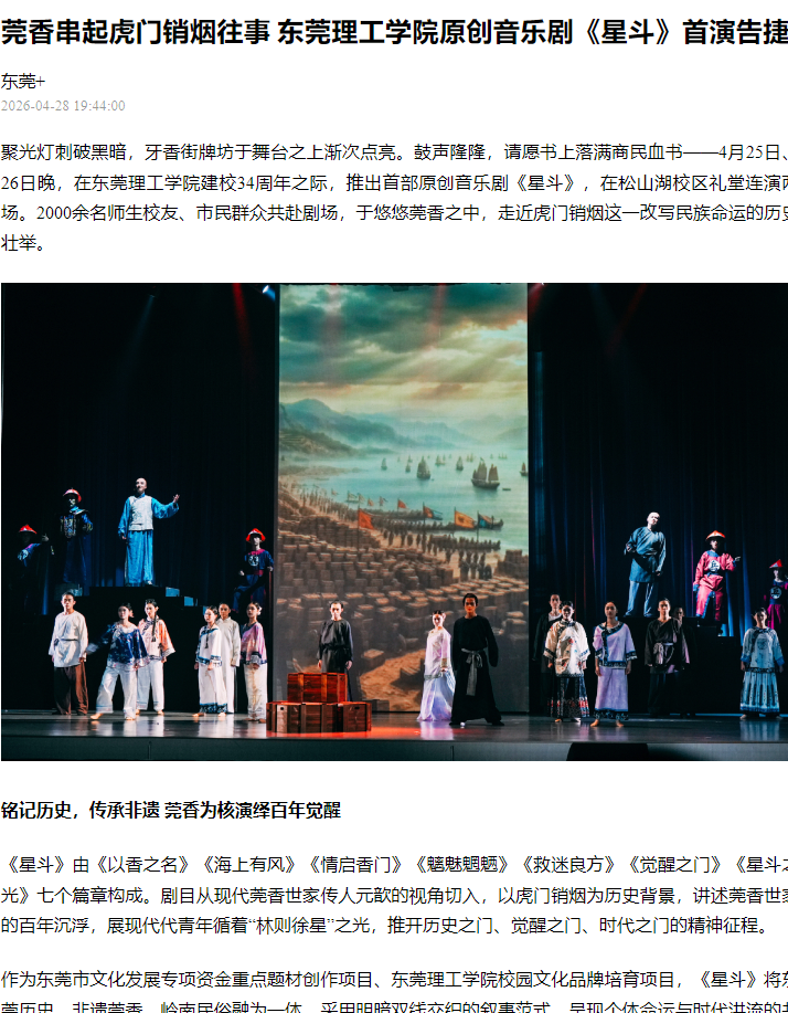 聚光灯刺破黑暗,牙香街牌坊于舞台之上渐次点亮。鼓声隆隆,请愿书上落满商民血书——4月25日、26日晚,在东莞理工学院建校34周年之际,推出首部原创音乐剧《星斗》,在松山湖校区礼堂连演两场。2000余名师生校友、市民群众共赴剧场,于悠悠莞香之中,走近虎门销烟这一改写民族命运的历史壮举。