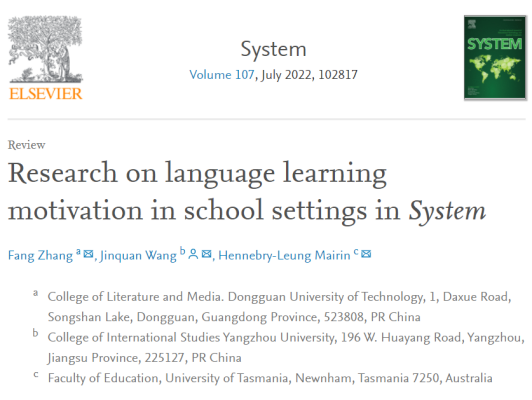 近日,文学与传媒学院张放博士以第一作者身份在语言学期刊《System》发表题目为《Research on language learning motivation in school settings inSystem》的学术论文。