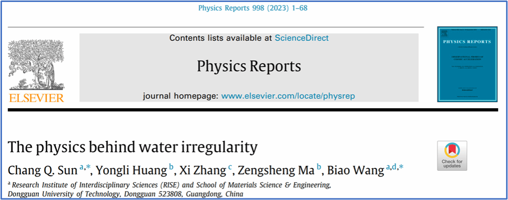 近期,交叉科学研究中心孙长庆教授应邀在物理学国际顶级期刊《物理学报告》上作为第一作者,发表了关于冰水反常物性物理机理的研究成果。周勇博士作为第一作者在胶体化学领域国际顶级期刊《胶体与界面科学前沿》上发表了多场微扰声子谱学研究成果。这两篇文章的第一完成单位均为东莞理工学院。