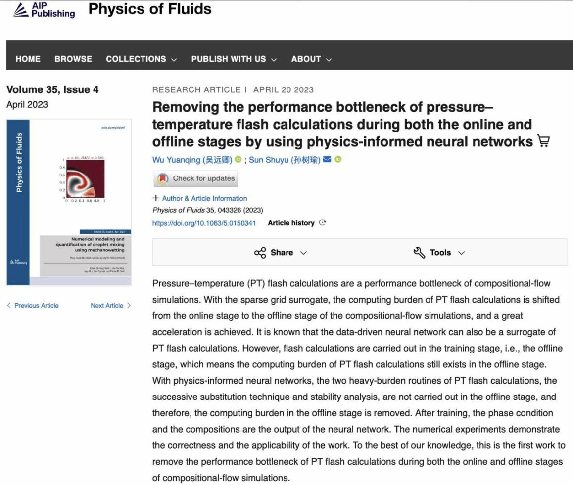 近日,吴远卿特聘副教授在流体力学领域权威期刊Physics of Fluids 上发表题目为Removing the performance bottleneck of pressure–temperature flash calculations during both the online and offline stages by using physics-informed neural networks的研究论文(DOI: https://doi.org/10.1063/5.0150341)。东莞理工学院为本文第一完成单位,阿卜杜拉国王科技大学的孙树瑜教授为本文通讯作者。