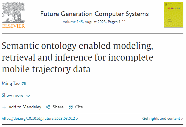 近日,我校物联网系统及应用团队(校级科研团队:TDYB2019009)在计算机领域TOP期刊Future Generation Computer Systems发表了基于语义本体的不完全移动轨迹数据建模、查询及推理方面的研究成果:Semantic ontology enabled modeling, retrieval and inference for incomplete mobile trajectory data。东莞理工学院计算机科学与技术学院(软件工程学院、网络空间安全学院)为论文第一署名单位,项目负责人陶铭教授为第一作者。