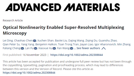近日,广东省新型纳米材料研究与应用工程技术中心程发良教授团队在非线性光学超分辨复用成像方面取得重要进展,相关研究成果以《Optical nonlinearity enabled super-resolved multiplexing microscopy》为题发表在材料领域顶级期刊《Advanced Materials》。团队中我校程发良教授、陈朝浩博士,北航王帆教授,悉尼科技大学Xiaoxue Xu和澳大利亚国立大学Lan Fu教授为共同通讯作者,东莞理工学院为第一完成单位。