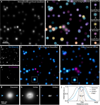 该工作利用涡旋光束将纳米材料的光学非线性特征传递到成像的点扩散函数(PSF)上,开发了一种鲁棒的超分辨多路复用成像策略,以区分具有独特光学非线性特征的纳米颗粒。通过探测图像中相应的PSF的变化,可以检索筛选纳米颗粒的成分信息。通过结合纳米材料的荧光颜色和非线性两个正交的成像维度,展示了单次扫描的四通道复用超分辨成像,其空间分辨率高于150 nm (1/6.5 λ)。这一突破性工作,不仅为现有的多路复用维度提供了一个新的正交维度——光学非线性,也首次实现了单颗粒的超分辨复用成像,这在生物成像、防伪、微阵列分析、深层组织多路复用检测和高密度数据存储方面显示出巨大的潜力。