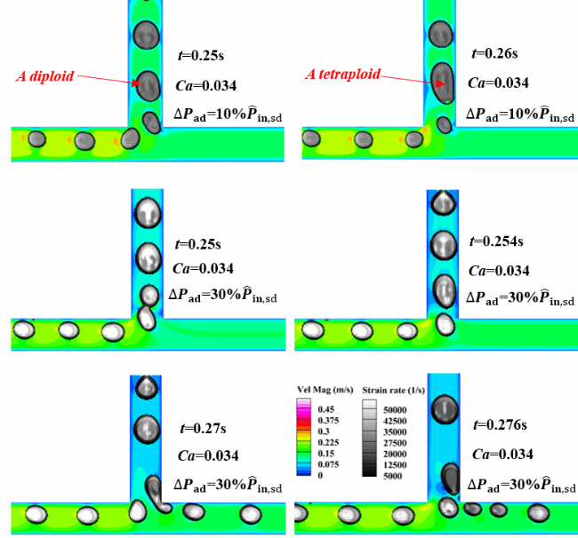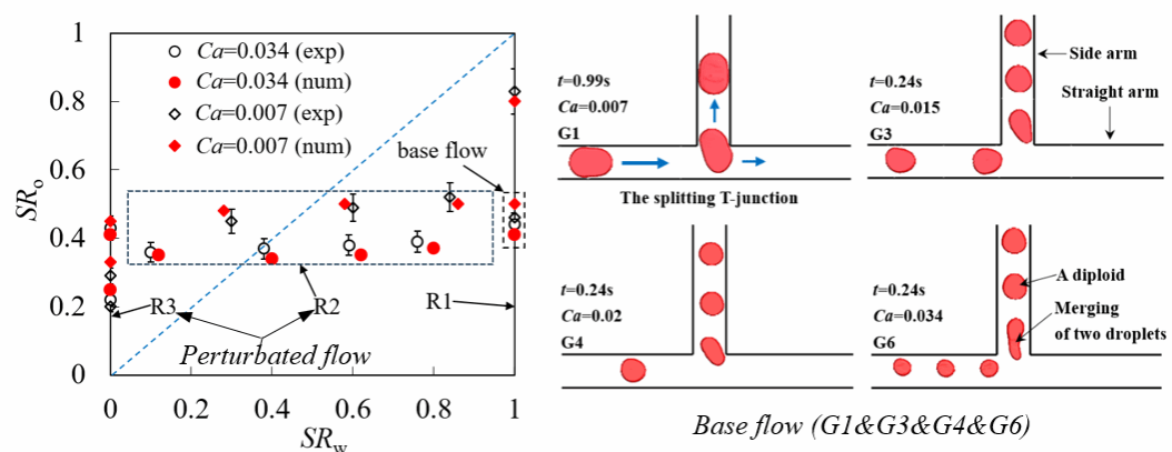 在自然界和很多人工系统内,存在诸多的分叉管道,这些分叉管道通过复杂的拓扑结构联系在一起形成复杂流路网络。人们早就发现血液细胞粒子在微小分叉血管内的复杂流动行为 (Phys. Rev. E, 74, 66104 (2006); Nature Phys. 15, 706-713(2019)),然而对细胞粒子“如何选择自己该流向哪个分支管?”这一问题的认识尚不够清楚。该论文通过微流控实验,结合计算机数值模拟,系统地研究了可变形液滴粒子群在微小分叉管道处的流动分配行为。研究发现液滴粒子在遇到分叉网络时会展现出一定的流动倾向性,粒子总是倾向于从流动发生破缺的方向流出。研究使用了“阻力扰动”方法来探明液滴粒子群在载流对称性发生改变时的自适应行为,结果发现液滴粒子流类似于一个弹性系统,在下游支管流动阻力比发生变化时,载流总是倾向于保持现状,只有当下游的“扰动”幅度超过临界值,载流在分支管的分配比例才会发生改变,这证实液滴流载流具有良好的抗冲击性能。论文还从能量的角度揭示了液滴的自适应行为,发现分叉管下游输入的阻力能量会优先通过液滴群的分裂、变形、合并与重分配来平衡,整个系统的压降会在液滴群的自适应过程中有效降低。液滴群的这种自适应行为符合自然界普遍存在的简单规律——“能量最低定理或最小作用量原理”。研究成果同样可以用于解释血细胞流动时的毛细分叉血管倾向性问题。