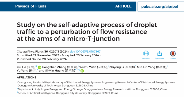 化能学院广东省分布式能源系统重点实验室在美国物理联合会旗下流体力学顶级期刊Physics of Fluids上发表题为“Study on the self-adaptive process of droplet traffic to a perturbation of flow resistance at the arms of a micro-T-junction”研究论文。