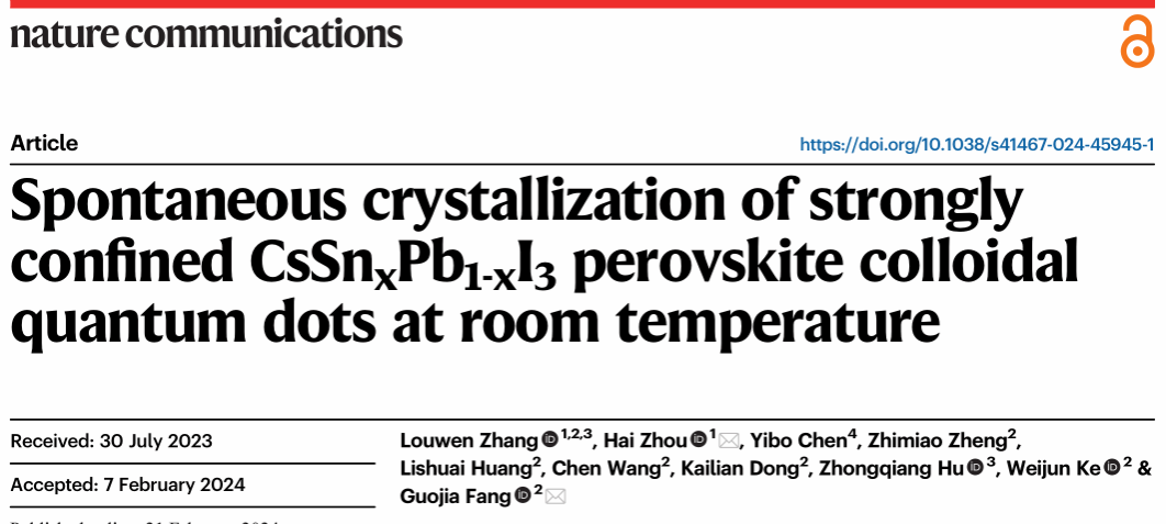 2024年2月21日,东莞理工学院周海特聘教授课题组联合武汉大学方国家教授课题组在Nature Communications(《自然•通讯》)上在线发表了关于纯碘全无机锡铅钙钛矿量子点的最新研究成果。