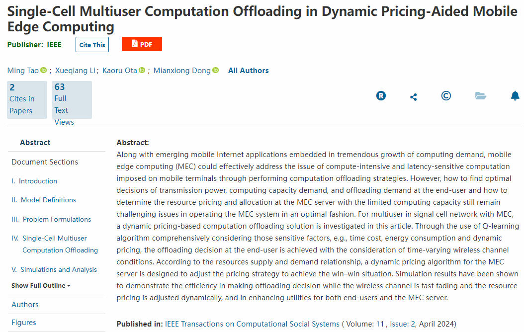 近日,我校物联网系统及应用团队(校级科研团队:TDYB2019009)在社会计算顶级国际期刊IEEE Transactions on Computational Social Systems(中国自动化学会推荐的A类期刊)录用了基于动态定价的多用户移动边缘计算卸载方面的研究成果《Single-cell Multi-user Computation Offloading in Dynamic Pricing-aided Mobile Edge Computing》。东莞理工学院计算机科学与技术学院(软件工程学院、网络空间安全学院)为论文第一署名单位,团队项目负责人陶铭教授为第一作者,日本室兰工业大学副校长、日本工程院外籍院士董冕雄教授为通信作者。