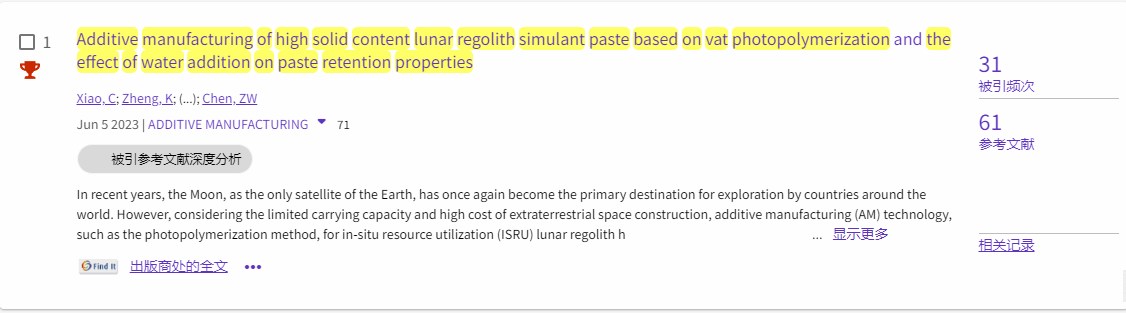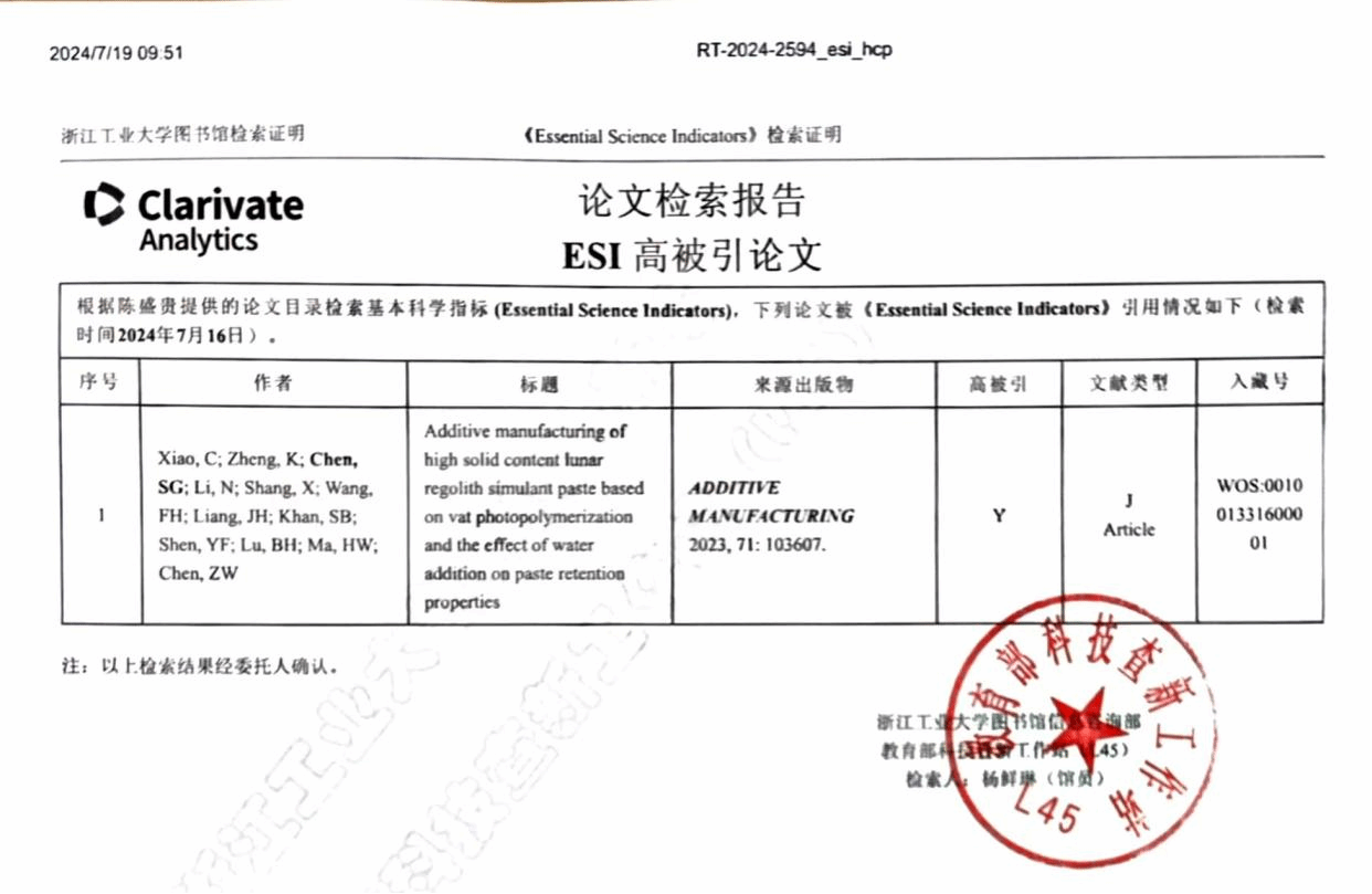 据科睿唯安ESI最新数据,我校3D打印与智能制造研究中心粤莞联合基金粤港澳研究团队项目“适应太空环境的月壤材料3D打印基础研究”课题组在增材制造领域的TOP期刊Additive Manufacturing(中科院JCR大类一区,IF=11.632)发表的研究论文《Additive manufacturing of high solid content lunar regolith simulant paste based on vat photopolymerization and the effect of water addition on paste retention properties》于2024年7月被ESI数据库遴选为高被引论文。该论文的第一署名单位为东莞理工学院,项目负责人马宏伟教授、项目核心成员陈盛贵副教授与深圳大学陈张伟教授为共同通讯作者,项目核心成员卢秉恒院士为论文提供指导并署名。