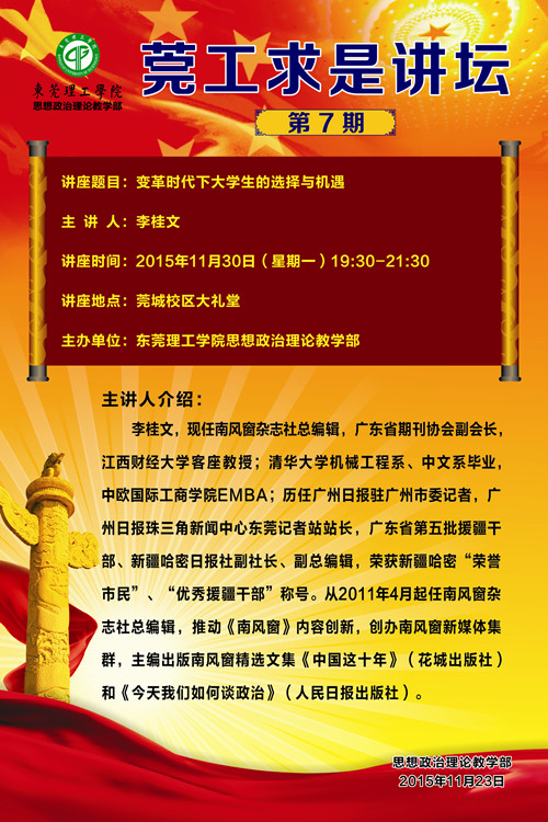 莞工求是讲坛:李桂文《变革时代下大学生的选择与机遇》