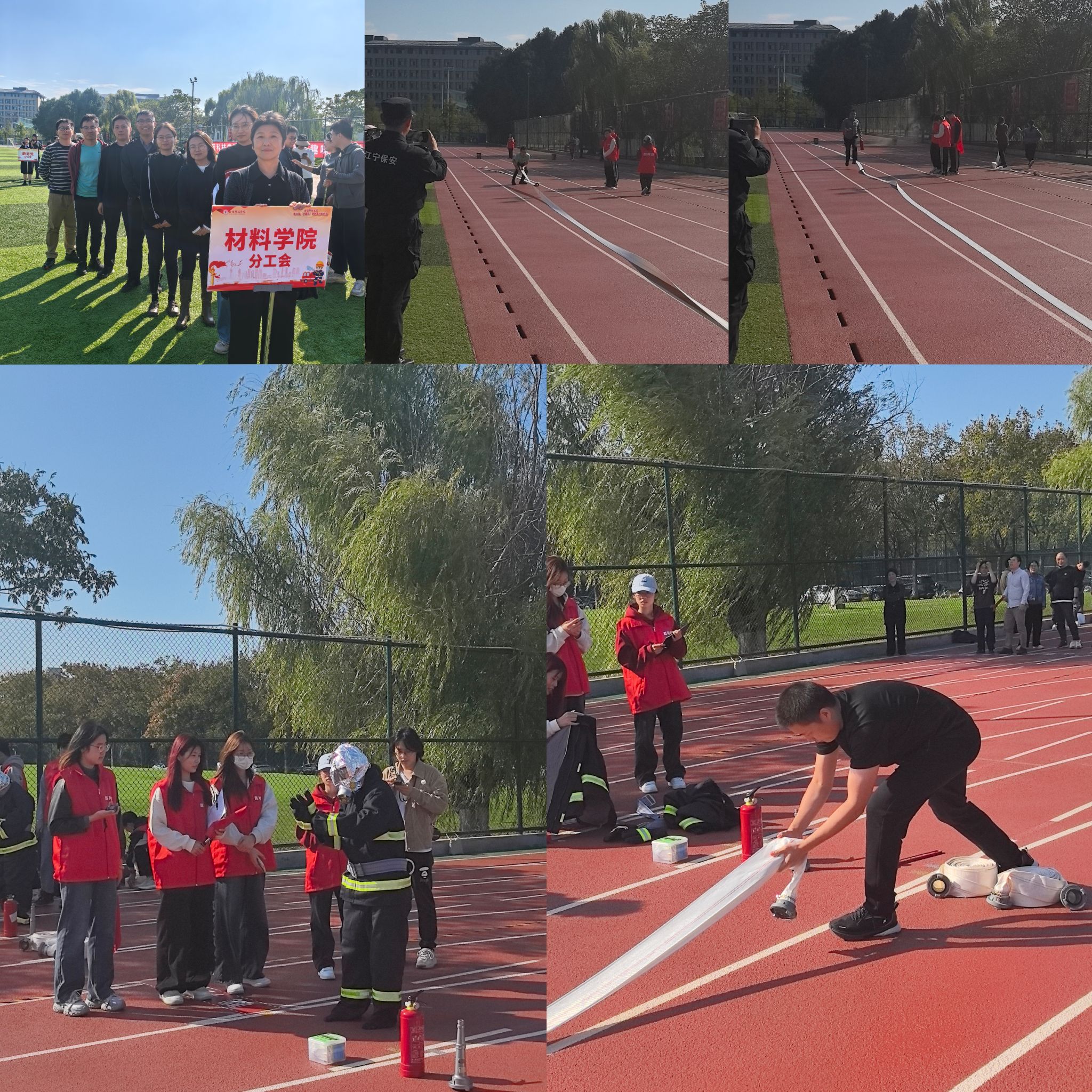 比赛现场气氛热烈,参赛者们个个精神饱满,斗志昂扬。在“模拟报警”环节中,大家迅速准确地完成了报警流程;在“穿戴消防服”环节,参赛者们以最快的速度穿戴整齐,展现了良好的应急反应能力;在“铺设水带”和“规范灭火”环节,大家团结协作,迅速有效地完成了灭火任务。整个运动会过程中,加油声、欢呼声此起彼伏,充满了积极向上的正能量。经过一系列紧张刺激的比赛,材料学院凭借出色的团队协作和消防技能,最终荣获了第五名的好成绩。