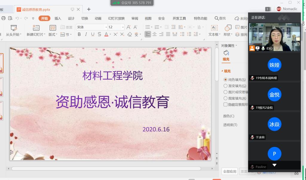 6月16日16:00我院开展了 “资助感恩,诚信教育”线上会议,会议由辅导员华岚芳老师主持,学院各班班长参加。华老师指出,2020年贫困生资格认证取消了旧版的《江苏省家庭经济情况调查表》,改由学生本人根据家庭经济情况书写的个人承诺书。会议还对毕业生贷款确认工作进行了布置,强调同学务必据实填写信息。华老师提出,希望班长将会议重点和会议精神传达给每位同学,让同学们深刻意识到诚信是为人做事的基本准则,日常生活和学习中需坚持践行诚信。