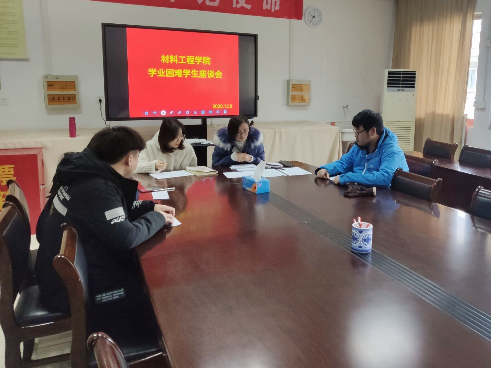 为进一步加强学院优良学风建设,营造良好的学习氛围,切实做好学业困难学生精准帮扶工作,12月8日,材料工程学院在工科楼会议室举办学业困难学生辅导座谈会。会议由材料工程学院学风建设工作负责辅导员王亚男主持,教务李银花老师出席,学业困难学生参加。