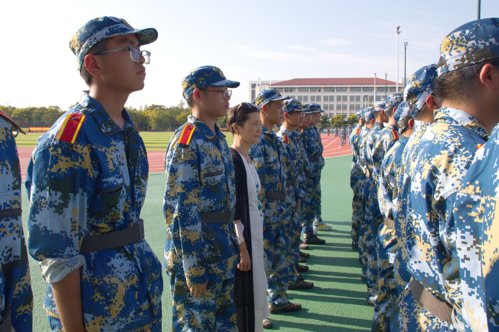 军训场上,新生们身着整齐的迷彩服,口号嘹亮、精神抖擞,动作整齐划一、步伐铿锵有力。党委书记叶原丰对新生的精神面貌和纪律性表示赞赏。他表示,在短暂的军训生活中,同学们战骄阳、斗酷热、经风雨、磨意志,必将以昂扬的激情迈开大学生活的第一步。院长郝凌云对中暑的同学表示了关切,提醒同学们及时补充水分,必要时就医。她还参与到训练队伍中来,同新生一起站军姿,以身作则,鼓励同学们体会军人作风、军人甘苦和军人品格。党委副书记陈智慧指出,新生军训是大学文化最重要的内容之一,希望同学们能以积极的态度和热情投入训练,厚植爱国情怀,锤炼坚强意志。
