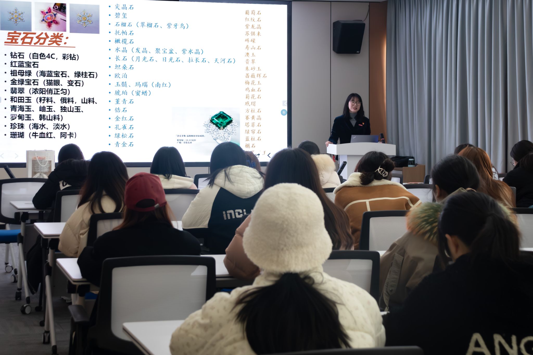 “芙蓉不及美人妆,水殿风来珠翠香”。本次讲座,周历老师向同学们介绍了常见的珠宝首饰,如各种宝石、翡翠和珍珠等,讲述了珠宝首饰的鉴赏与搭配技巧。此外,周老师还对不同风格的穿搭技巧进行了详细介绍,包括服装和饰品的搭配、服装色彩与材质的选择等,以生动有趣、浅显易懂的授课教会了同学们如何根据自己的风格选择合适的珠宝饰品。此次讲座不仅给女生们讲解了美容美学方面的技巧方法,还提高了同学们对美的欣赏、鉴别和搭配能力。讲座结束后,同学们收获良多,纷纷表示要在生活中修炼由内而外的“美”。