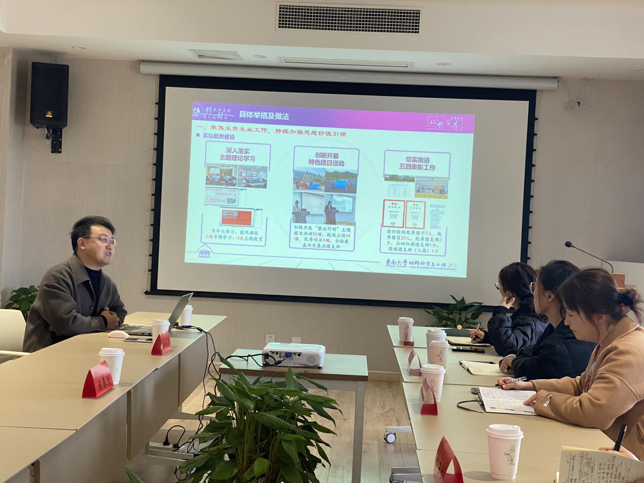 活动伊始,施春陵副书记对我院学工团队一行的到访表示热烈欢迎,并介绍了东南大学材料科学与工程学院的概况及近年来学生工作取得的优异成果和长足发展。韩铖副书记表示了感谢并介绍了我院的办学历史、专业特色和学生基本情况。接着,韩林原主任分享了学办、共青团等工作,重点介绍了东南大学材料科学与工程学院的学生基层组织建设、特色品牌活动、生为首位理念、素质教育导向、学生教育管理及工作亮点成果等方面取得的成绩。随后,双方就科创竞赛、就业推动、学风建设、学困生帮扶、活动与专业融合度等方面进行了深入的探讨与交流。