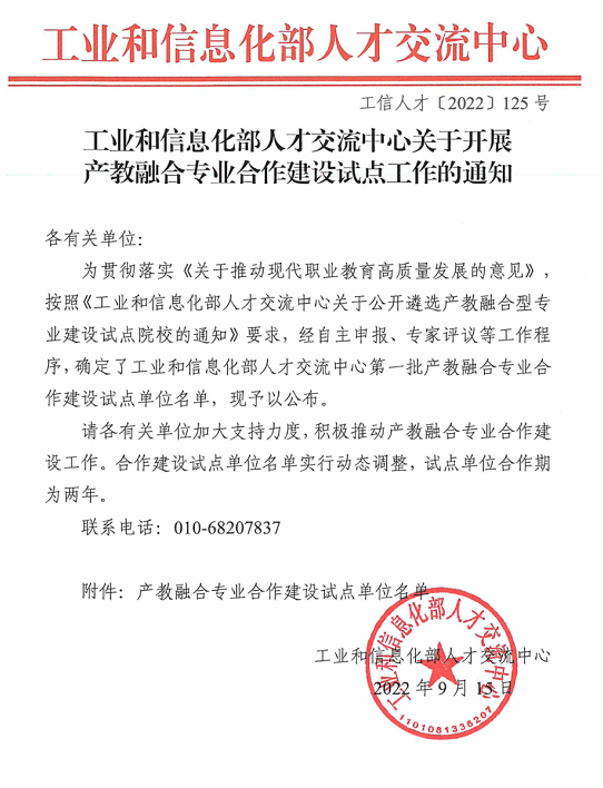 9月15日,工业和信息化部人才交流中心发布关于开展产教融合专业合作建设试点工作的通知。我校计算机科学与技术专业成功入选。