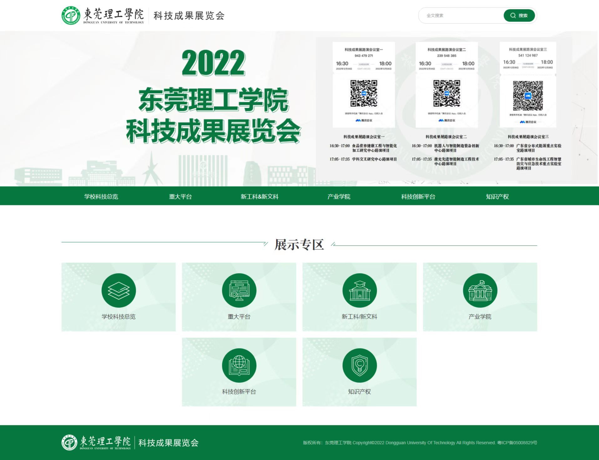 线上展览则划分了学校科技总览、重大平台、新工科&新文科、产业学院、科技创新平台及知识产权六个专区,共有9个重大平台,12个二级学院,6个产业学院及5个科技创新平台展示了其产出的科技成果。展览网址是https://kjz.dgut.edu.cn/。