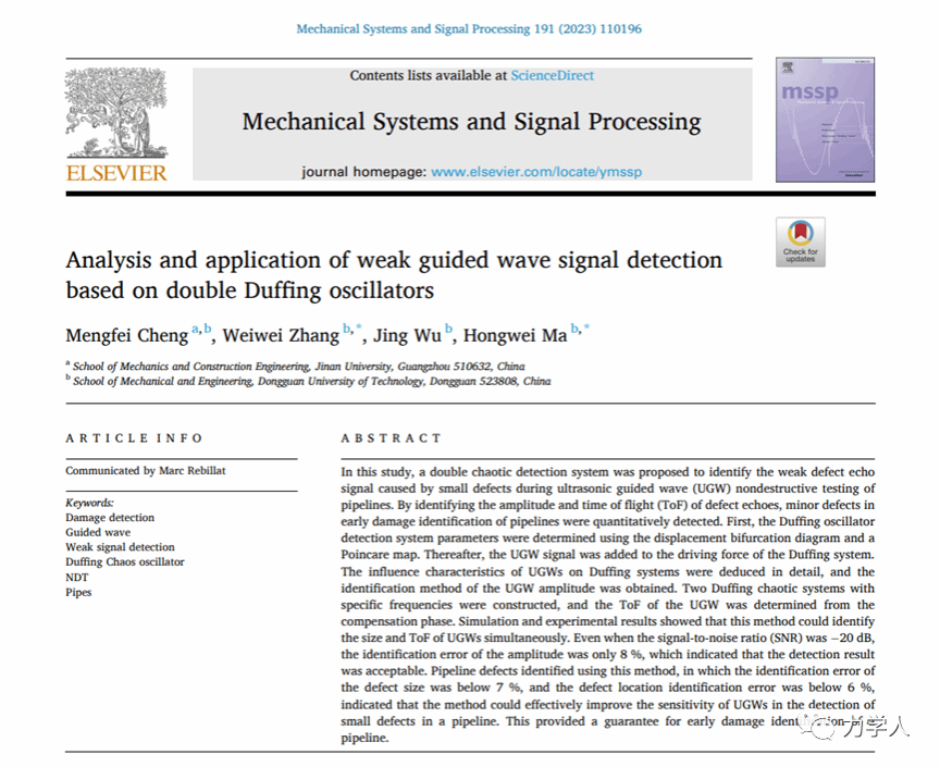 近日,我校马宏伟教授团队在国际知名期刊Mechanical Systems and Signal Processing发表最新成果:Analysis and application of weak guided wave signal detection based on double Duffing oscillators,巧妙利用混沌系统的敏感性构造了双混沌检测系统,实现弱超声导波信号的定量检测,该方法为弱导波信号的定量检测提供了理论基础。
