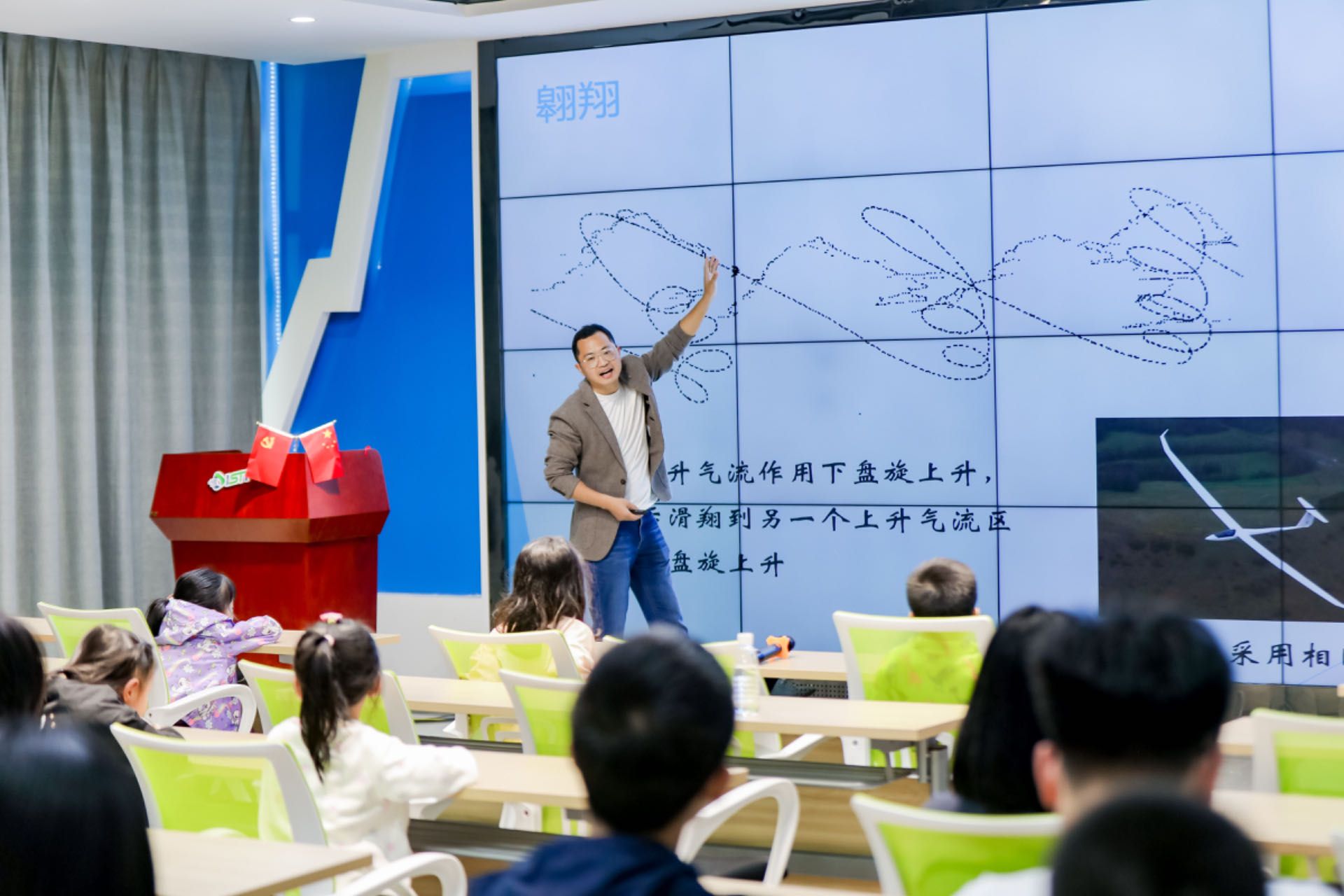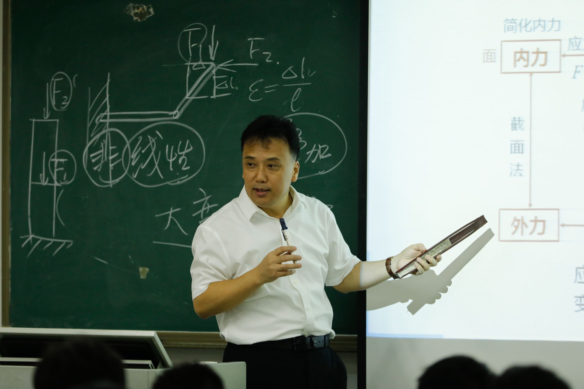 讲台上,马宏伟教授手持小纸条面向同学们展示,一位学生在旁协助,用电吹风向小纸条“送风”。伴随着风力从一档到二档,小纸条也从垂直向下变成抖动的状态。