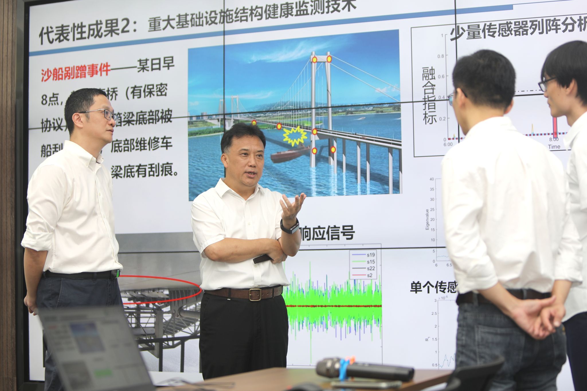 团队还积极鼓励不同学科专业的青年教师互相交流,拓宽思考方向,探索学科交叉融合的可能性。林逸洲博士的学科背景是力学,其课题与大桥传感器相关。进入团队后,他与光电专业的刘晔教授进行了探讨,了解了传感器的底层原理、传感器行业现状以及设备成本等问题。他对此感受很深:“在那之前,我作为算法研究者,只关心能否获取我需要的物理量。但在工程实践中,最终的监测方案其实都与刘晔教授提到的这些因素息息相关。”