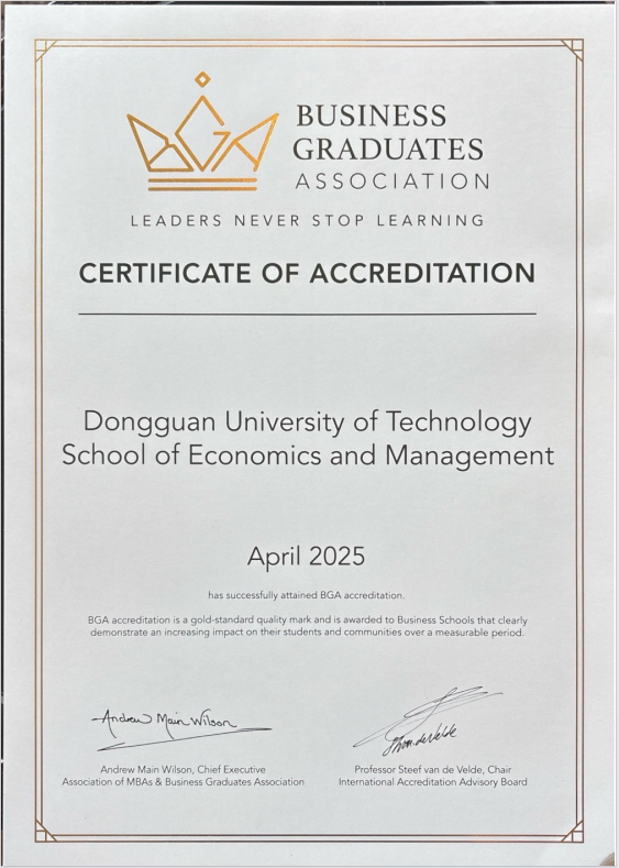 近日,经济与管理学院收到国际工商管理硕士协会(Association of MBAs,简称AMBA)暨商学院毕业生协会(Business Graduates Association,简称BGA)颁发的BGA金牌认证证书。这一殊荣不仅使经管学院成为BGA金牌国际认证的商学院,更让东莞理工学院成为全球63所获此认证的院校之一,同时这也是学校获得的首个国际商科认证,标志着学校商科教育迈向了新的国际高度。