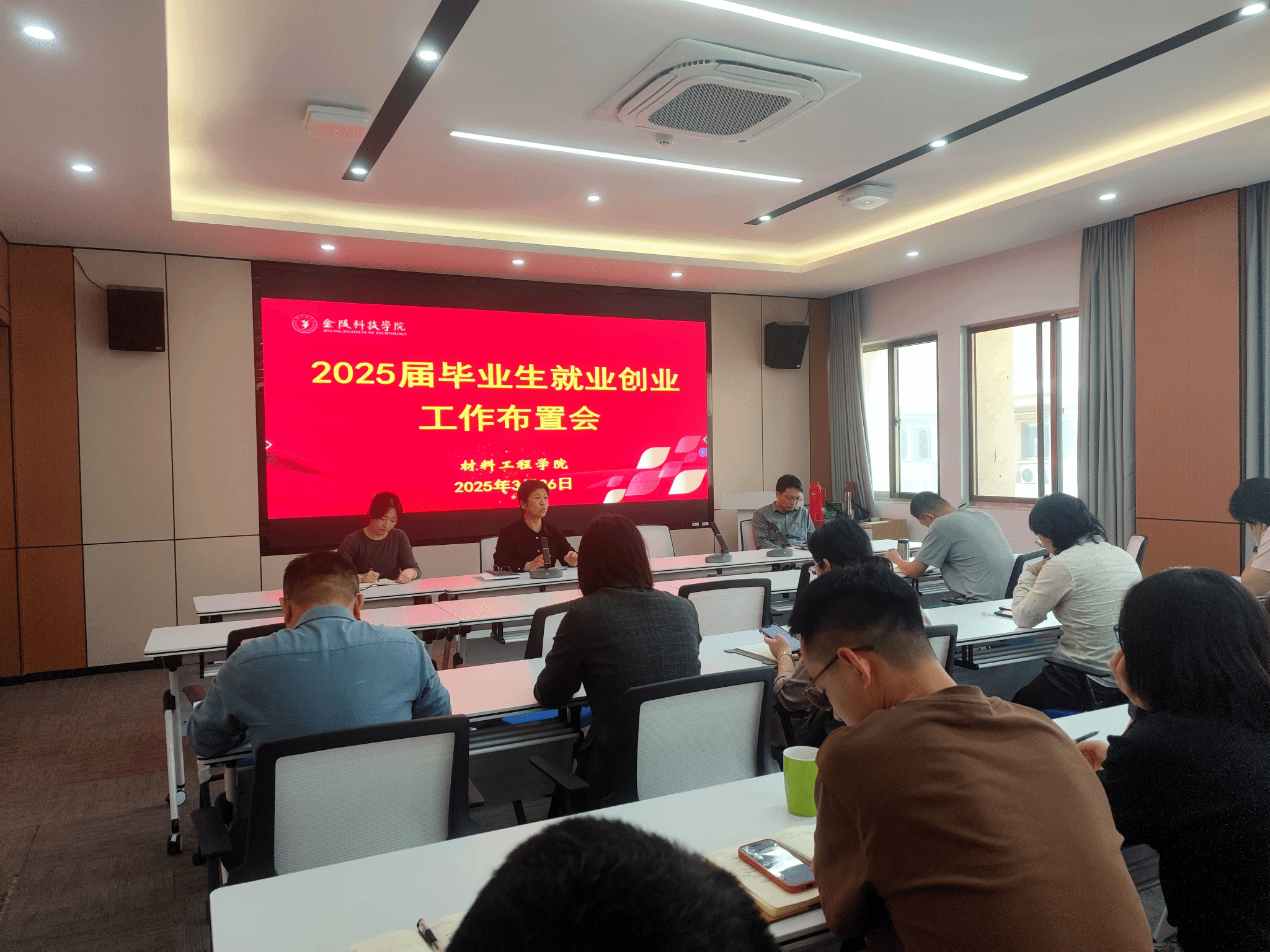 3 月 26 日,材料工程学院在知行楼 A506 会议室召开 2025 届毕业生就业创业工作布置会。学院党委书记陈健、副书记韩铖及副院长管航敏,各系支部书记、系主任,院就业干事及全体毕业班辅导员、班主任参加,共同为毕业生就业工作献计献策。会议由陈健书记主持。