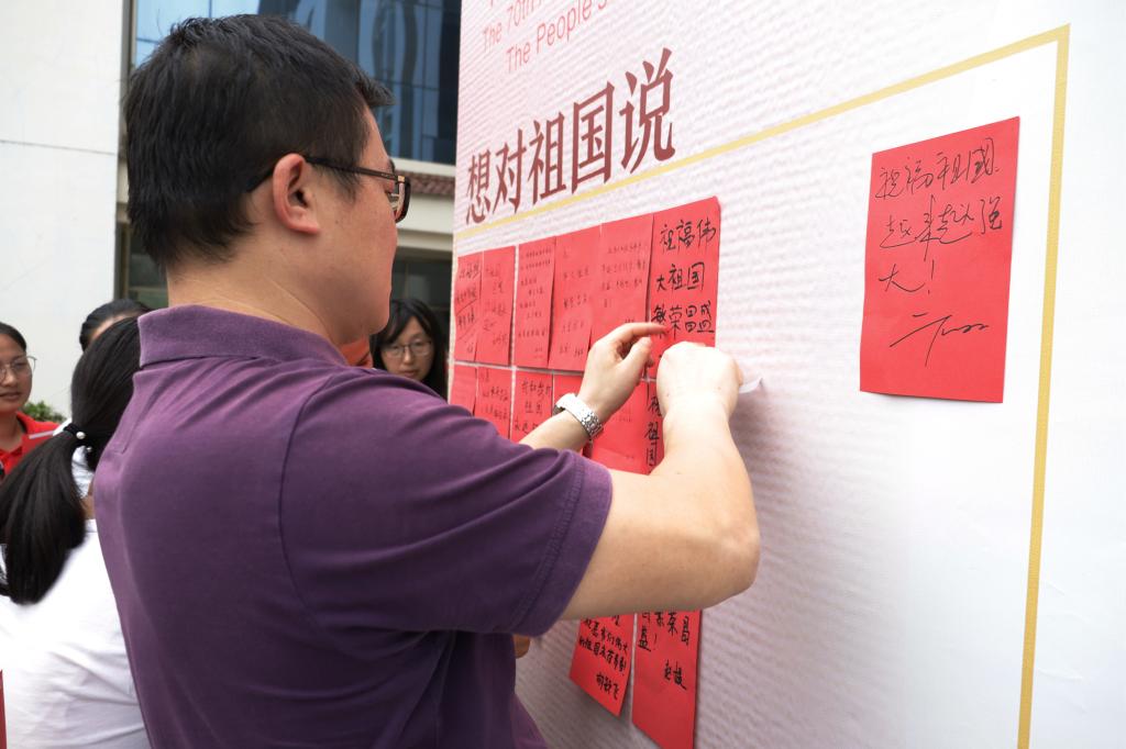 在喜迎中华人民共和国成立70周年之际,为进一步激发广大师生的爱国热情,充分表达全院师生对伟大祖国的真挚情感。材料工程学院于9月25日下午组织开展“我和我的祖国”签名寄语活动,学院党政负责人集体出席,全体教职工和部分学生党员代表70人参加。