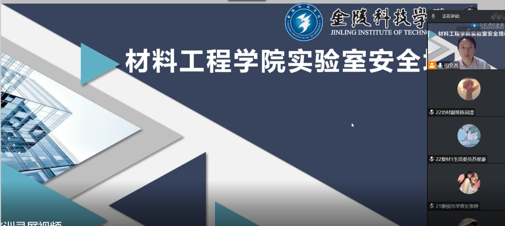 材料工程学院高度重视实验室安全管理工作,为在疫情防控常态化过程中,进一步落实《金陵科技学院实验室危化品使用安全专项治理行动工作方案》,丰富和完善材料工程学院实验室安全教育培训体系,保障实验室安全稳定运行,2022年10月21日19:00,继2022年5月开展毕业生实验室安全培训之后,材料工程学院实践教学中心与学生工作办公室再一次联合,以腾讯会议的方式组织实验室安全线上培训,培训对象为22级、19级、20级、21级150名班委。