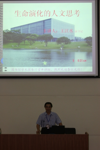 昨天晚上,一场题为“生命演化的人文思考”的学术报告在图书馆学术报告厅进行。学院临时党委副书记王江水为现场二百余名学生精彩阐述了“生命演化的人文思考”。