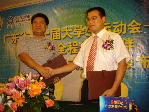 7月13日,广东省第七届大学生运动会筹备委员会与中国移动通信有限责任公司东莞分公司签定了全程合作伙伴协议。广东省第七届大学生运动会东莞市筹备委员会办公室主任、东莞市人民政府副秘书长朱益民和中国移动通信有限责任公司东莞分公司陈永快先生分别代表大运会筹委会和中国移动通信有限责任公司东莞分公司签约,并在签约仪式上讲了话。