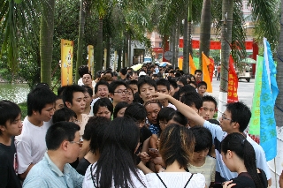 为了感谢东莞市民对大运会的支持,东莞市委市政府特地拿出一定数量的广东省第七届大学生运动会开幕式的入场券赠送给市民。消息一传出,赠票时间虽然是8月2日早上9点30分,但从7点开始,就有许多东莞市民陆续从各镇区来到东莞理工学院城市学院,排队领取开幕式入场券。记者在现场看到,排队等候赠票的市民约有1000多人。尽管天气炎热,但在公安人员和志愿者的维持下,队伍井然有序,从校门口一直延伸到学院行政办公大楼,足有200米长。原定于赠票时间是下午4点结束,但在上午12点,赠票就已经全部赠送完毕。