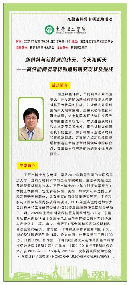 莞工科普系列活动|2021年第8场:新材料与新能源的昨天、今天和明天——高性能陶瓷增材制造的研究现状及挑战