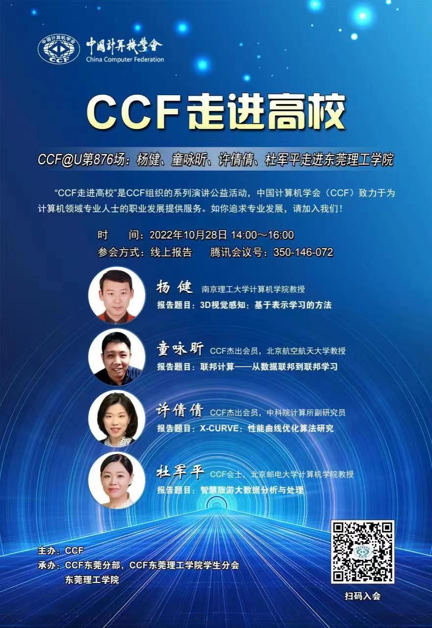 学术预告|CCF走进高校 CCF@U第876场:杨健、童咏昕、许倩倩、杜军平走进东莞理工学院