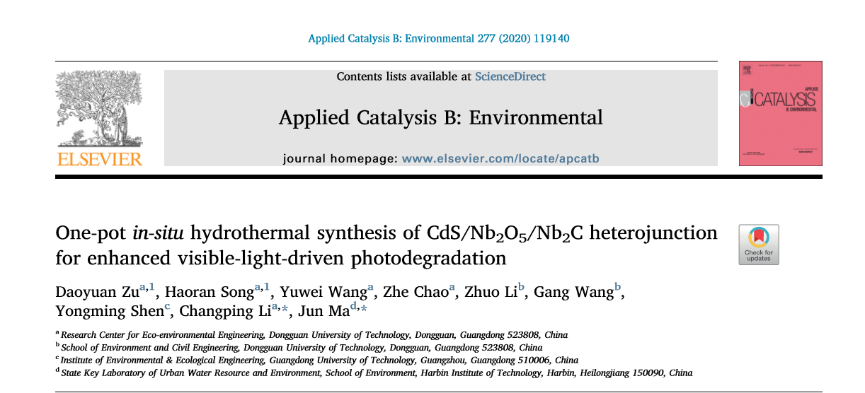 近日,学校生态环境工程技术研发中心李长平教授课题组硕士研究生祖道远以共同第一作者身份,在二维MXene材料去除环境污染物方面取得进展,研究成果以“One-pot in-situ hydrothermal synthesis of CdS/Nb2O5/Nb2C heterojunction for enhanced visible-light-driven photodegradation”为题发表在著名学术期刊《Applied Catalysis B:Environmental》上。