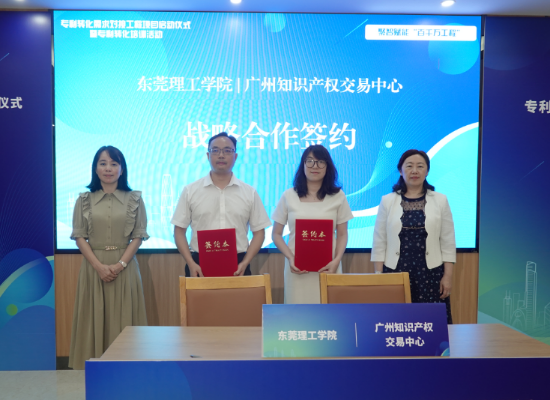 在与会领导嘉宾共同见证下,东莞理工学院与广州知识产权交易中心、广州知识产权交易中心与虎门镇科技企业代表进行了战略合作签约。随后,东莞理工学院发布了东莞理工学院存量专利转化资源库,标志着专利转化需求对接工程项目正式启动。首批发布的存量专利涵盖电子信息、新能源与节能、新材料、环境保护等多个技术领域,与虎门镇重点产业、特色产业高度契合。