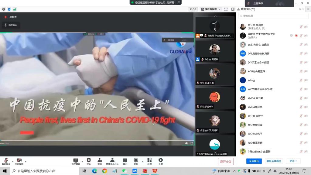 校团委在3月的学生社团负责人研习会议上开展《中国抗疫中的“人民至上”》微团课,引导我校学生社团骨干充分认识中国特色社会主义制度的显著优势,进一步加强爱国主义教育。疫情期间,各学生社团积极参与志愿服务活动,分别在4个城市、15个镇区,累计服务1000余人次,共计志愿服务时长243.5小时。