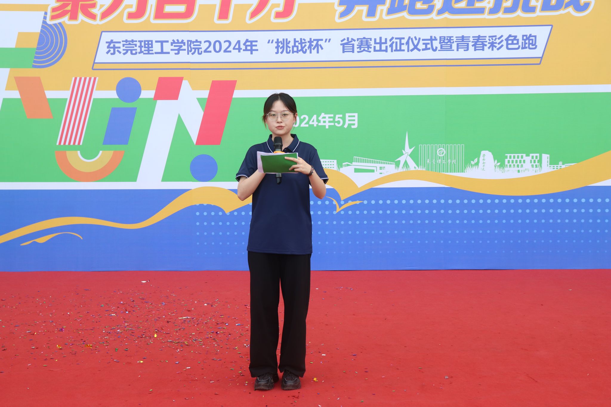 学校2024年五四青年奖章集体奖、挑战杯省赛决赛参赛队伍——零电惠农团队学生负责人王悦代表全体出征团队发言。她表示:“我们东莞理工学院创新创业师生团队,即将带着服务双百行动、助力支撑东莞高质量发展的成果出征2024年挑战杯省赛,我们将以此为新起点,传承弘扬五四精神,持续投身于科技创新、乡村振兴、绿色发展、社会服务、卫国戍边,让青春在火热实践中挺膺担当。”