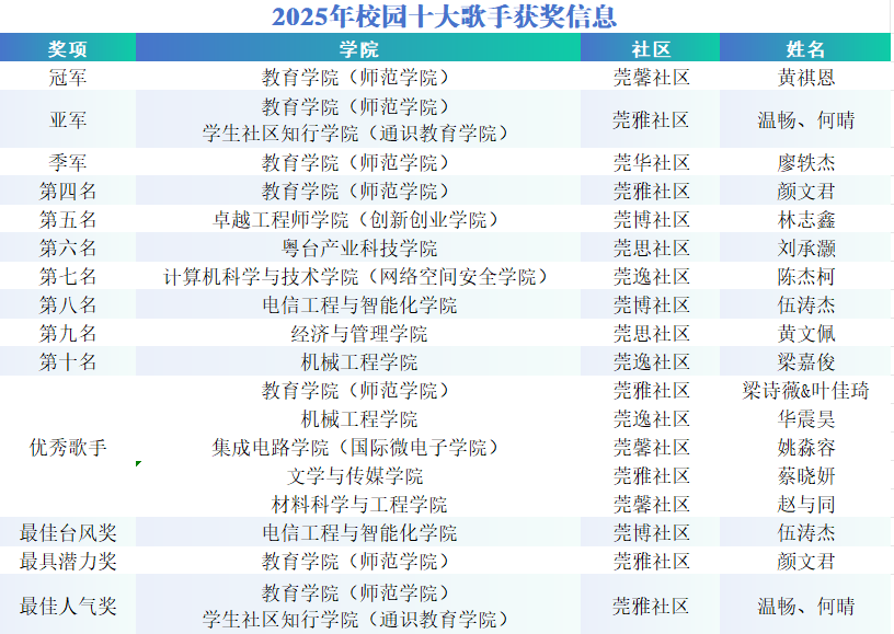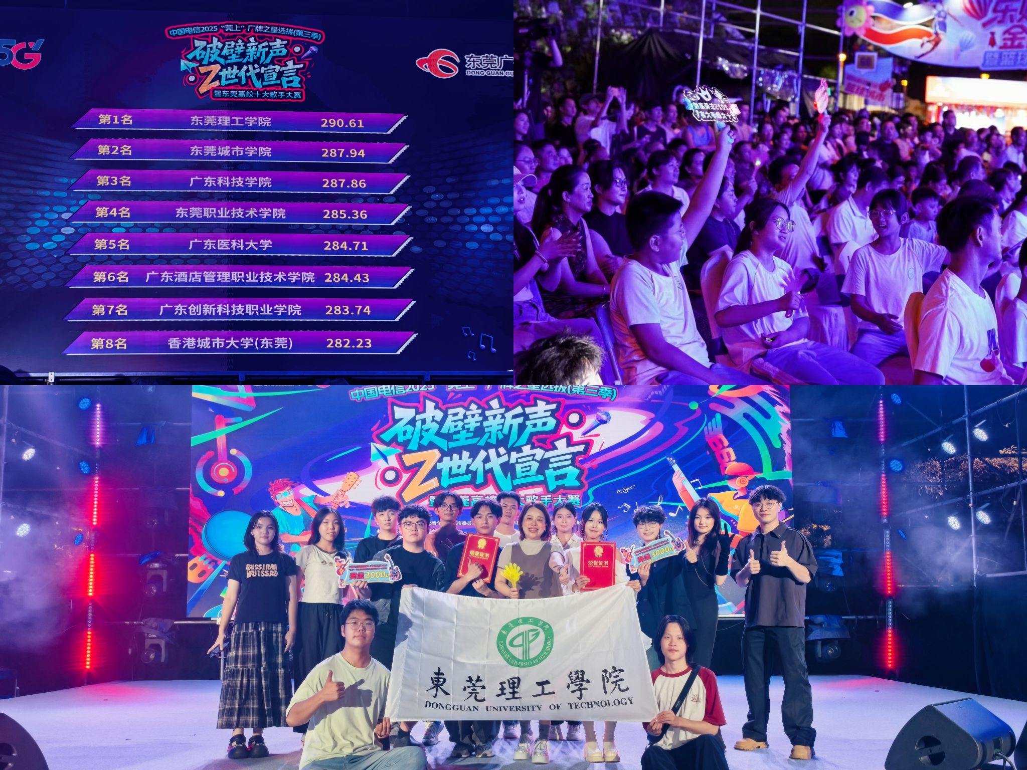 此外,近日举办的2025“莞上”厂牌之星选拔(第三季)暨东莞高校十大歌手大赛,汇聚了东莞8所高校24位歌手,我校艺术团选手从强手如林的竞争中脱颖而出,荣获冠亚军和团体总分第一的成绩。