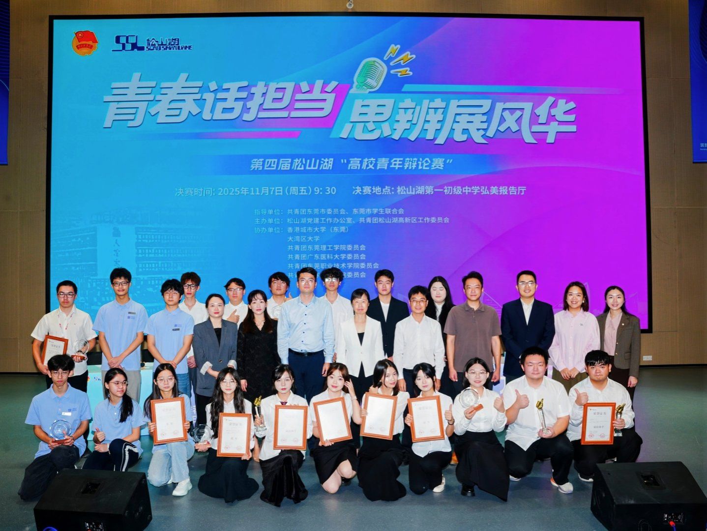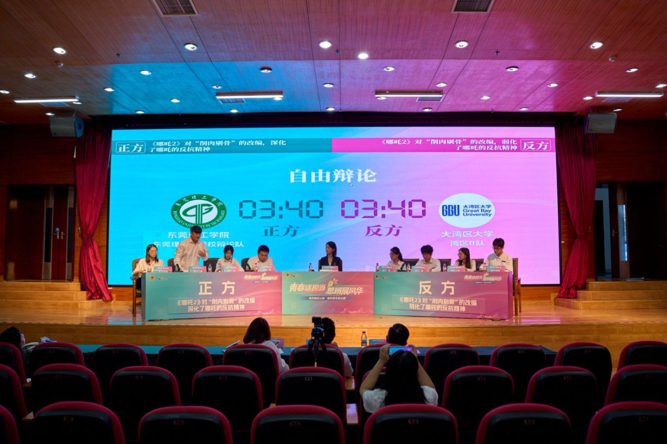 本届辩论赛以“青春话担当,思辨展风华”为主题,吸引了包括大湾区大学、广东医科大学、东莞理工学院、广东科技学院、东莞职业技术学院等多所高校的代表队参与。赛事自启动以来,竞争激烈,我校辩论队历经初赛、半决赛的层层考验,最终与东莞职业技术学院会师决赛。决赛中,围绕“‘算法推荐技术’刷新了当代青年人的认知深度”这一时代性辩题,我校辩手从技术效率与认知拓展角度切入,通过扎实的论据和清晰的逻辑层层推进,以精准的质询与有力的回击赢得评委一致认可。