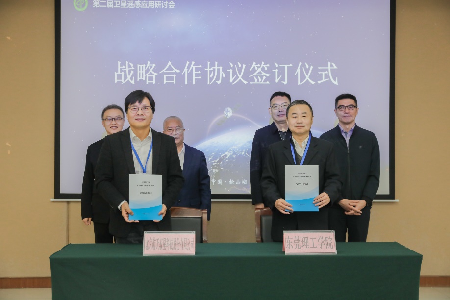 会上,邵颂东教授向与会嘉宾详细介绍了卫星地面站建设历程、数据接收平台运行状况以及未来发展目标。随后,举办了东莞理工学院与北京航天驭星科技股份有限公司战略合作协议签订仪式。在徐勇军副校长、黄跃飞教授、庄国京研究员和赵磊董事长的共同见证下,邵颂东教授与张建华高级副总裁分别代表双方签署了战略合作协议,标志着双方将携手在卫星遥感领域开展深度合作,实现资源共享与优势互补,共同推动技术创新与应用转化。