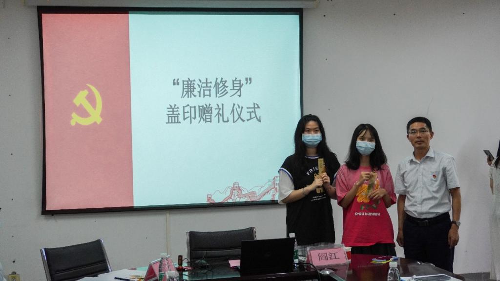 活动上还举行了“廉洁修身”盖印赠礼仪式。校纪委领导依次郑重地在“莲花书签”上盖“廉洁修身”印章并将“书签尺”赠与毕业生党员。盖印赠礼仪式结束后,毕业生党员纷纷谈自己的感想,2018级广电专业1班的利晨慧同学分享了“保住底线,不断提高上限”的心得;2018级广编专业1班的吴心怡同学认为毕业生步入社会后,面对权力、经济的考验,要做到对自我的深刻提醒,片刻不放松;2018级汉语言文学专业1班的曾妙婷同学抒发了无论是作为党员还是群众都应做到廉洁修身的感悟。