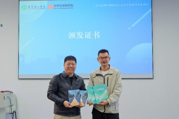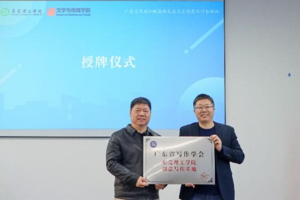 随后,文学与传媒学院党委书记阎江为广东省写作学会会长、暨南大学教授胡伟颁发客座教授聘书。胡伟向学院捐赠了其主编的《人工智能辅助写作丛书》及自传体长篇小说《我们在路上》。现场,“广东省写作学会东莞理工学院创意写作基地”正式揭牌,标志着校地协同推动创意写作学科发展、服务新大众文艺创作迈入了新阶段。