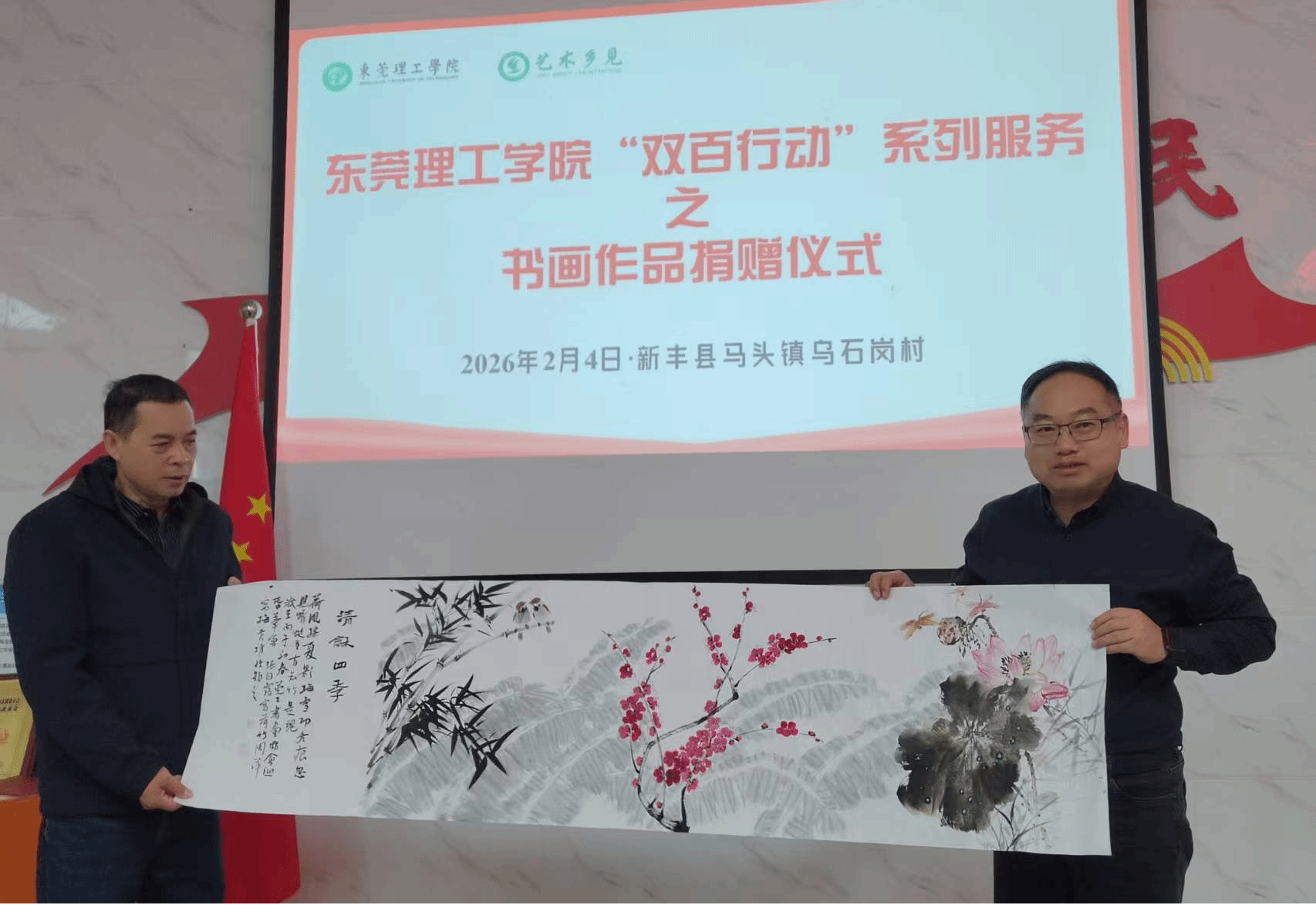 为扎实推进“双百行动”走深走实,以艺术之力赋能韶关新丰县乡村文化振兴,2月3日至4日,东莞理工学院文传学院赴新丰县开展“双百行动”系列服务活动,并完成艺术乡见(新丰)工作室在新丰县图书馆(新馆)的现场布置工作。学校驻新丰县“双百行动”服务队队长陈礼明共同参与,校地携手以文化服务架起共建桥梁,让艺术扎根乡土、点亮乡村。