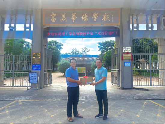 杜应发代表法社学院校友会向富美小学捐赠了多媒体投影设备一套。富美小学校长李春兴表示热烈欢迎法律宣传青年突击队到校开展以“反校园欺凌”为主题的暑期社会实践活动,这对引导小学生正确认识校园欺凌,规范自身言行和建立良好人际关系有着重要的教育意义。